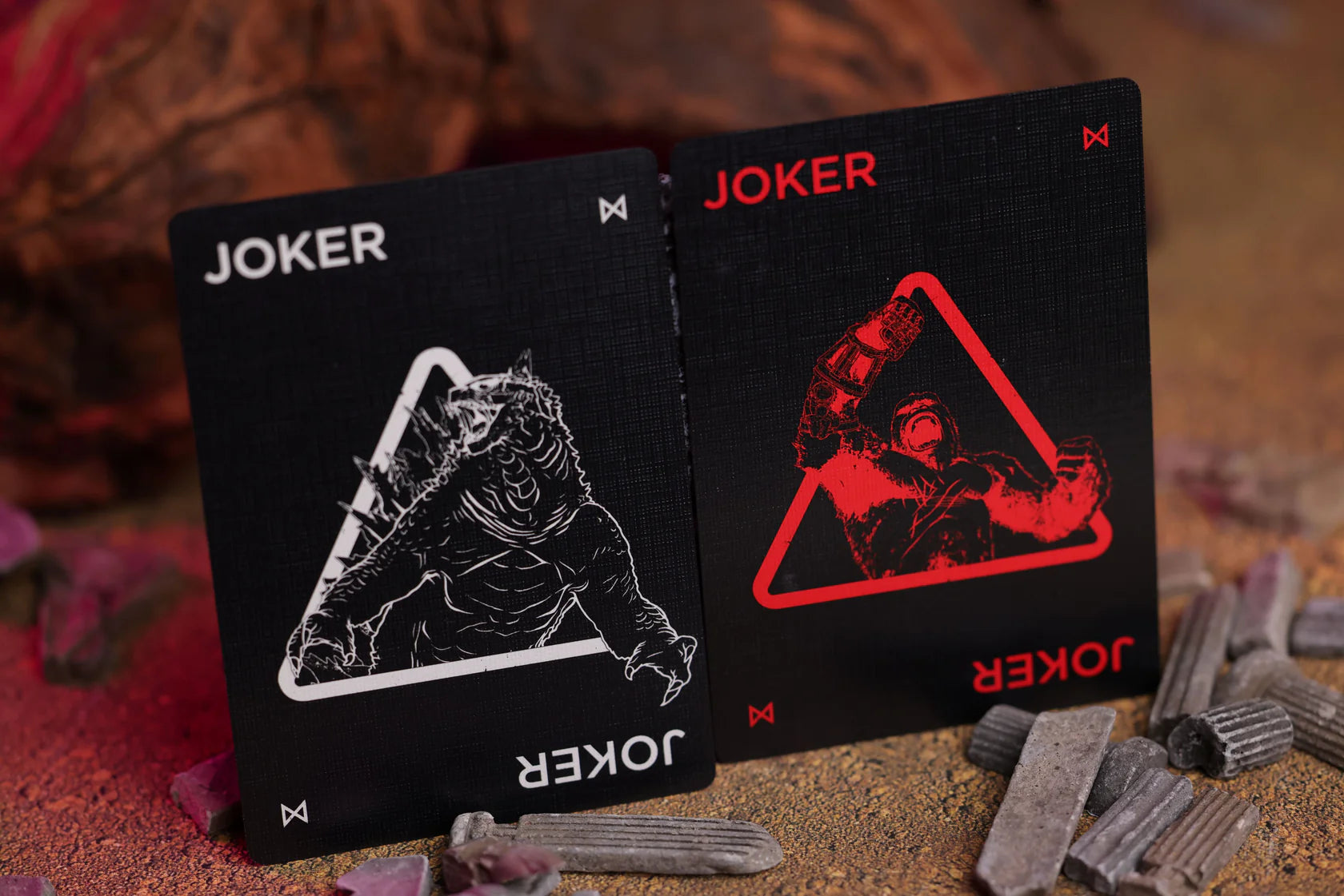 Las ediciones especiales de las barajas Godzilla x Kong: The New Empire vienen presentadas en un estuche tipo acordeón único, diseñado exclusivamente por Room One Cards. Este empaque exclusivo captura la silueta icónica de los legendarios titanes, evocando una sensación épica desde el primer vistazo.