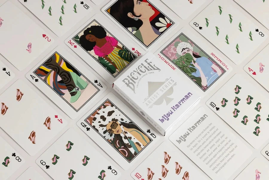 Cada carta es una obra de arte: cada anverso de la carta presenta obras del portafolio de Bijou Karman.
